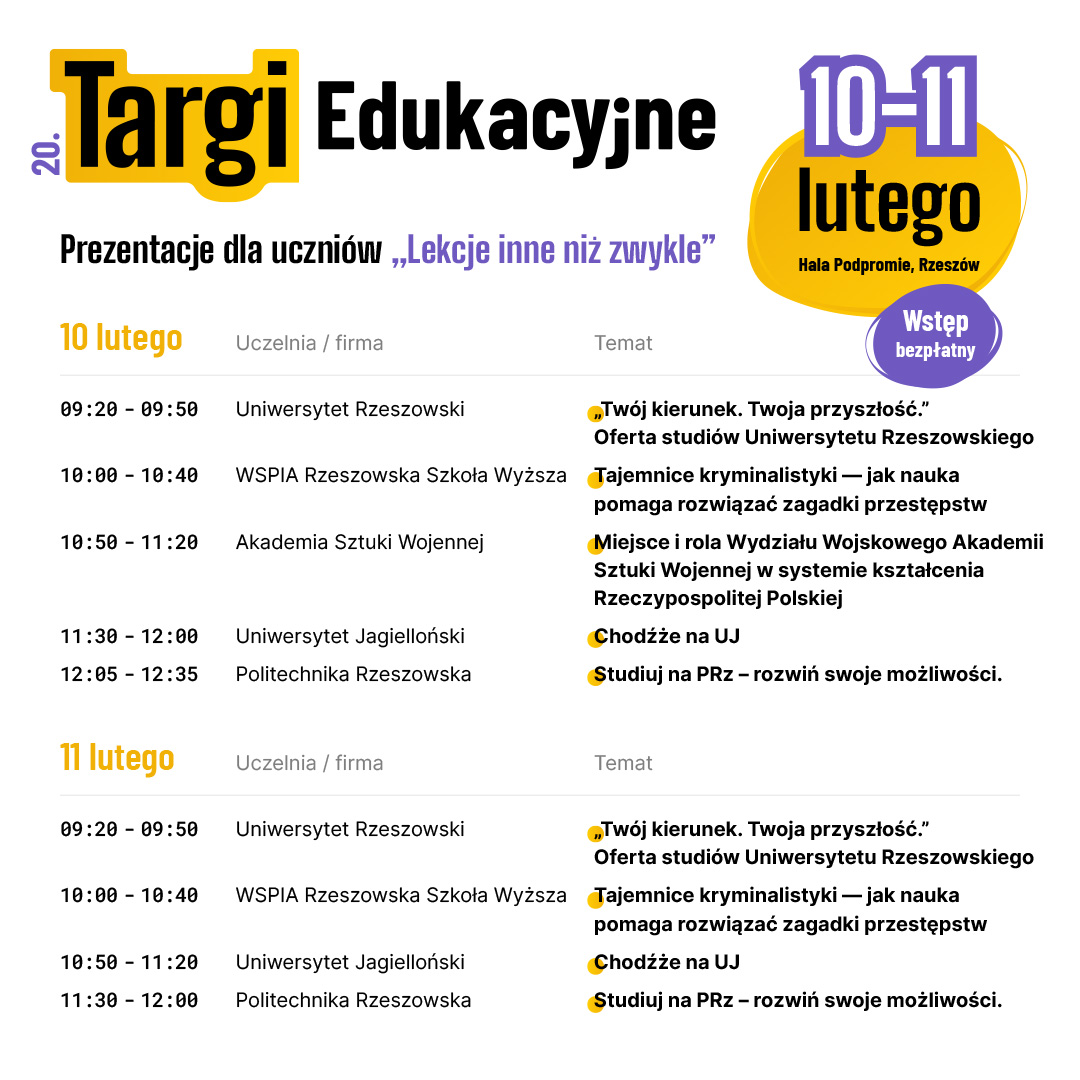 W dniach od 10 do 11 lutego 2026 r., na Hali Podpromie (Regionalne Centrum Widowiskowo-Sportowe im. Jana Strzelczyka) w Rzeszowie odbędą się 20 Podkarpackie Targi Edukacyjne EduSalon, do zwiedzania których zapraszamy uczniów wszystkich klas szkół średnich, a w szczególności tegorocznych maturzystów oraz nauczycieli.